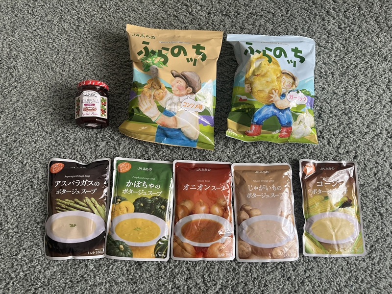 他にもJAふらの販売のポテトチップス、レトルトのスープを購入しています。