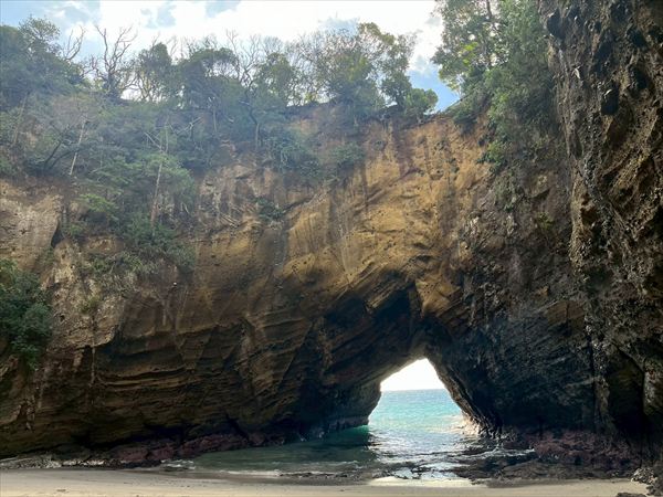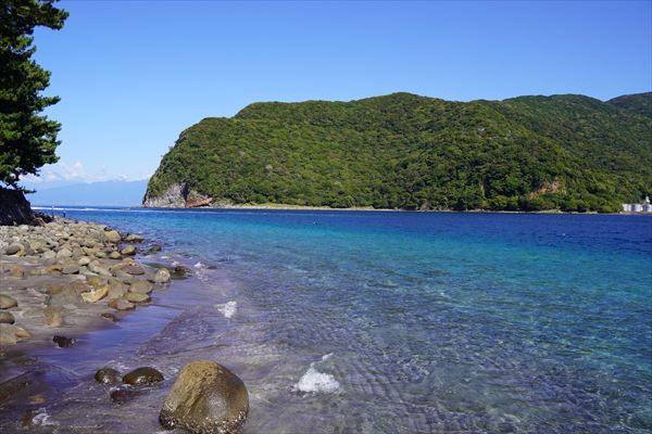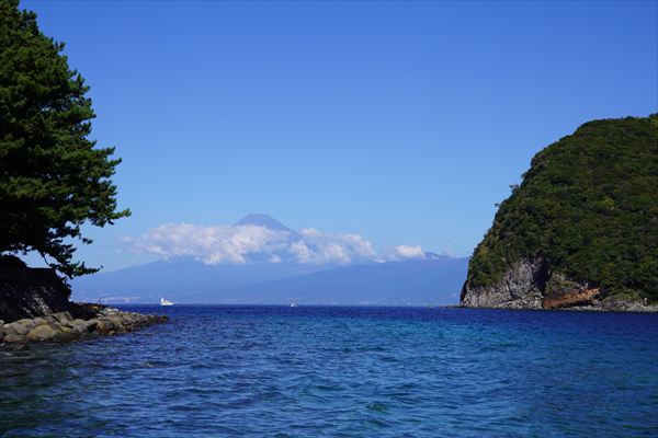 岬の鳥居からの景色 戸田岬の海水は透明度が高くとても澄んでいました。また戸田港は駿河湾につながる深い港になっており、その戸田岬沿いは浅瀬と深場により素敵なグラデーションが形成されています。