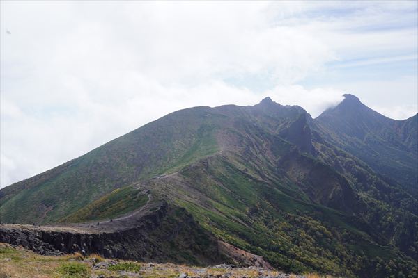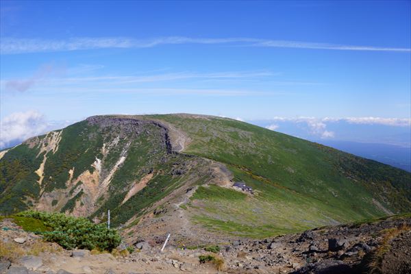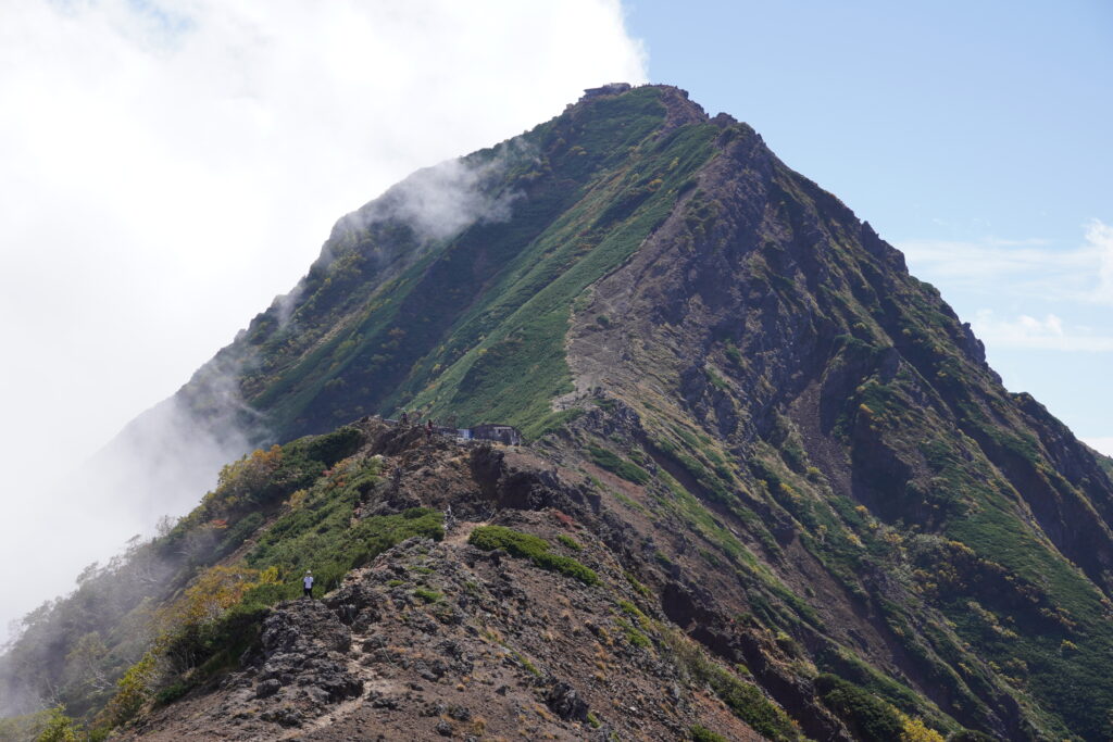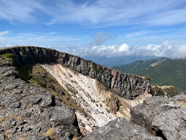 硫黄岳の山頂は、緑の滑走路と荒れた爆裂火口から形成され、全く違う二面性を持ちます。
