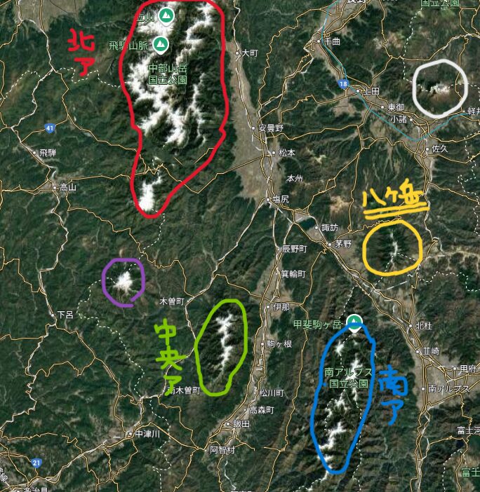 下記図を見るとわかりやすいですが、八ヶ岳は、どのアルプスにも属していない独立連峰であることがわかります。同じように独立した峰として、白丸の浅間山(軽井沢)、紫丸の御嶽山(下呂)などがあります。これらの独立峰は、各アルプスから眺めた際、高さがるので目立ちますが、アルプス山脈ほど連なっていないため、あれはなんだ??としばしば思います。